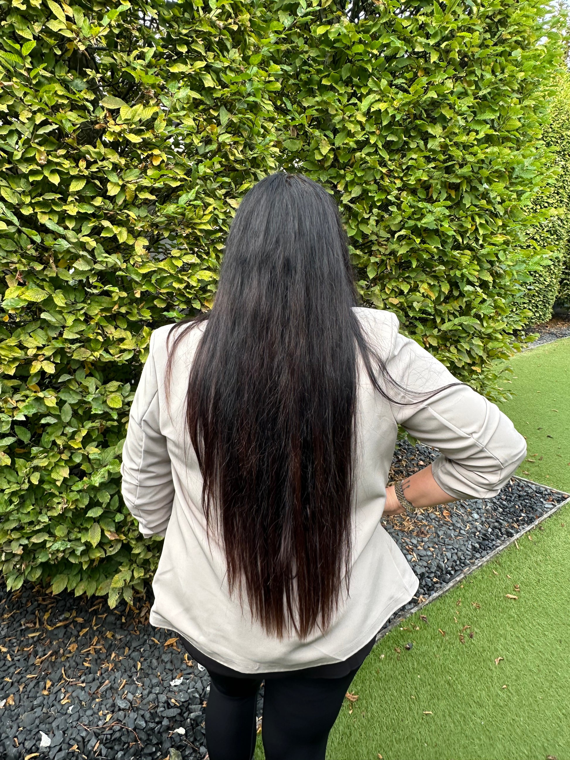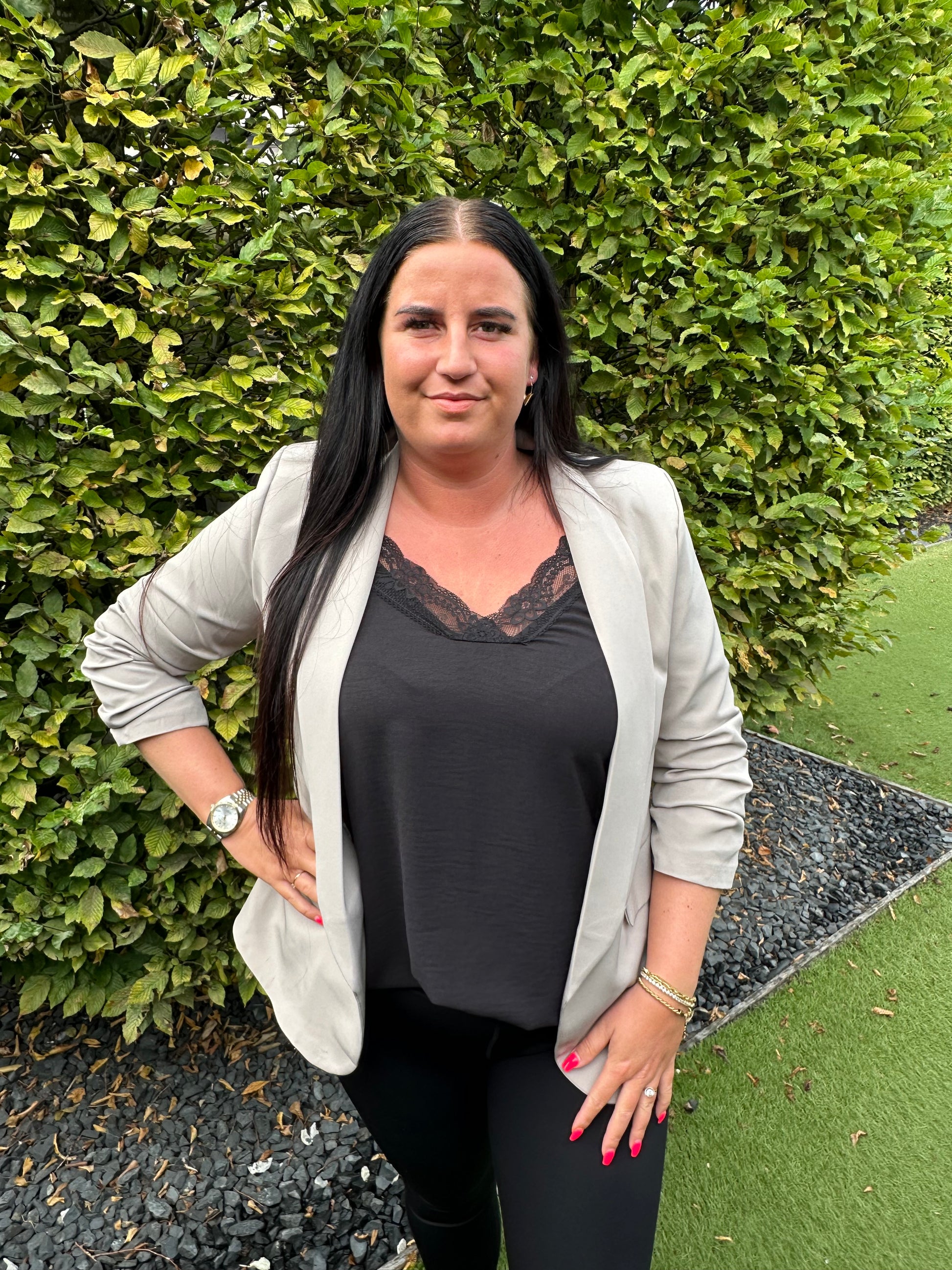 De blazer heeft 2 nepzakken aan de voorzijde en geen knopen.