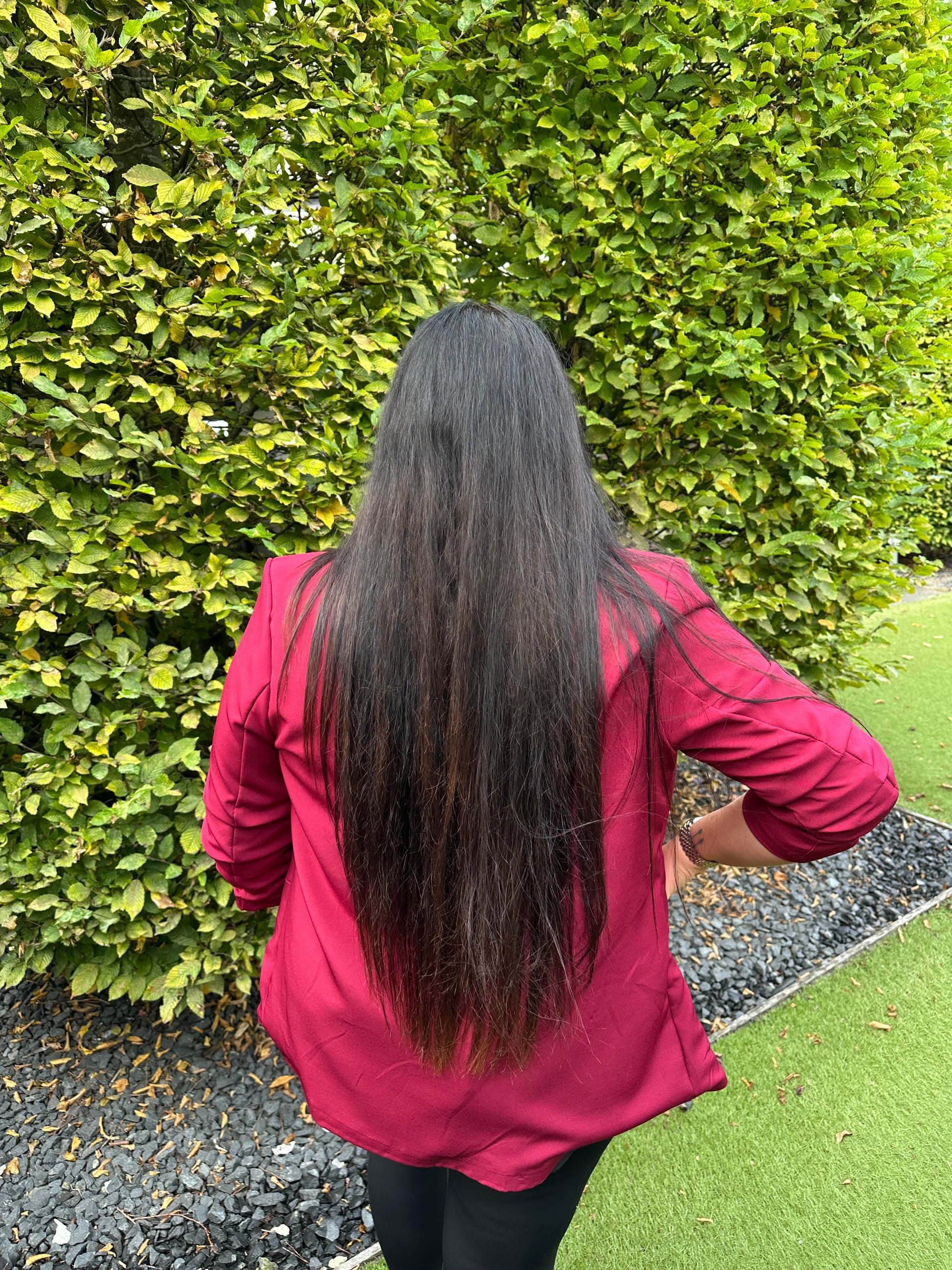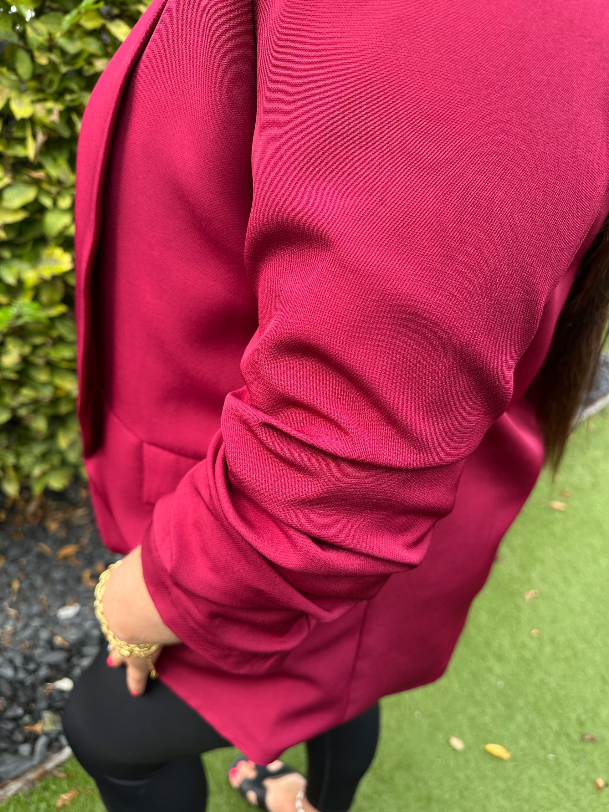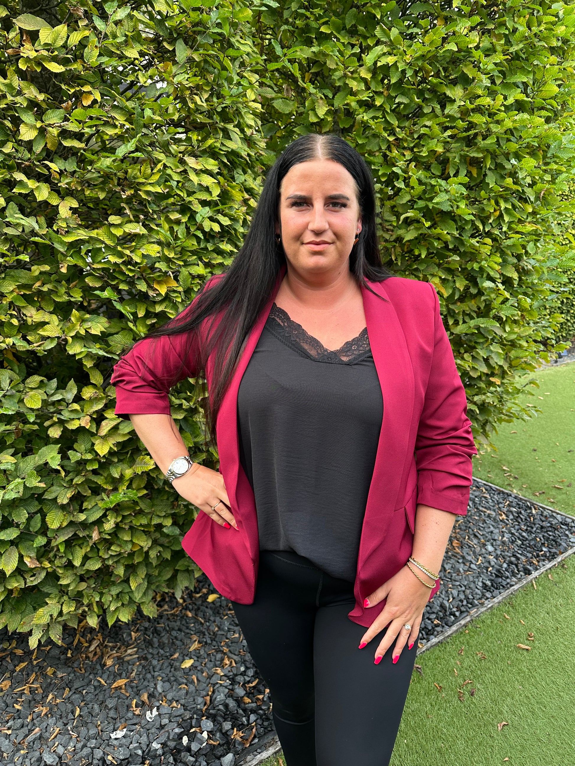 De blazer heeft 2 nepzakken aan de voorzijde en geen knopen.