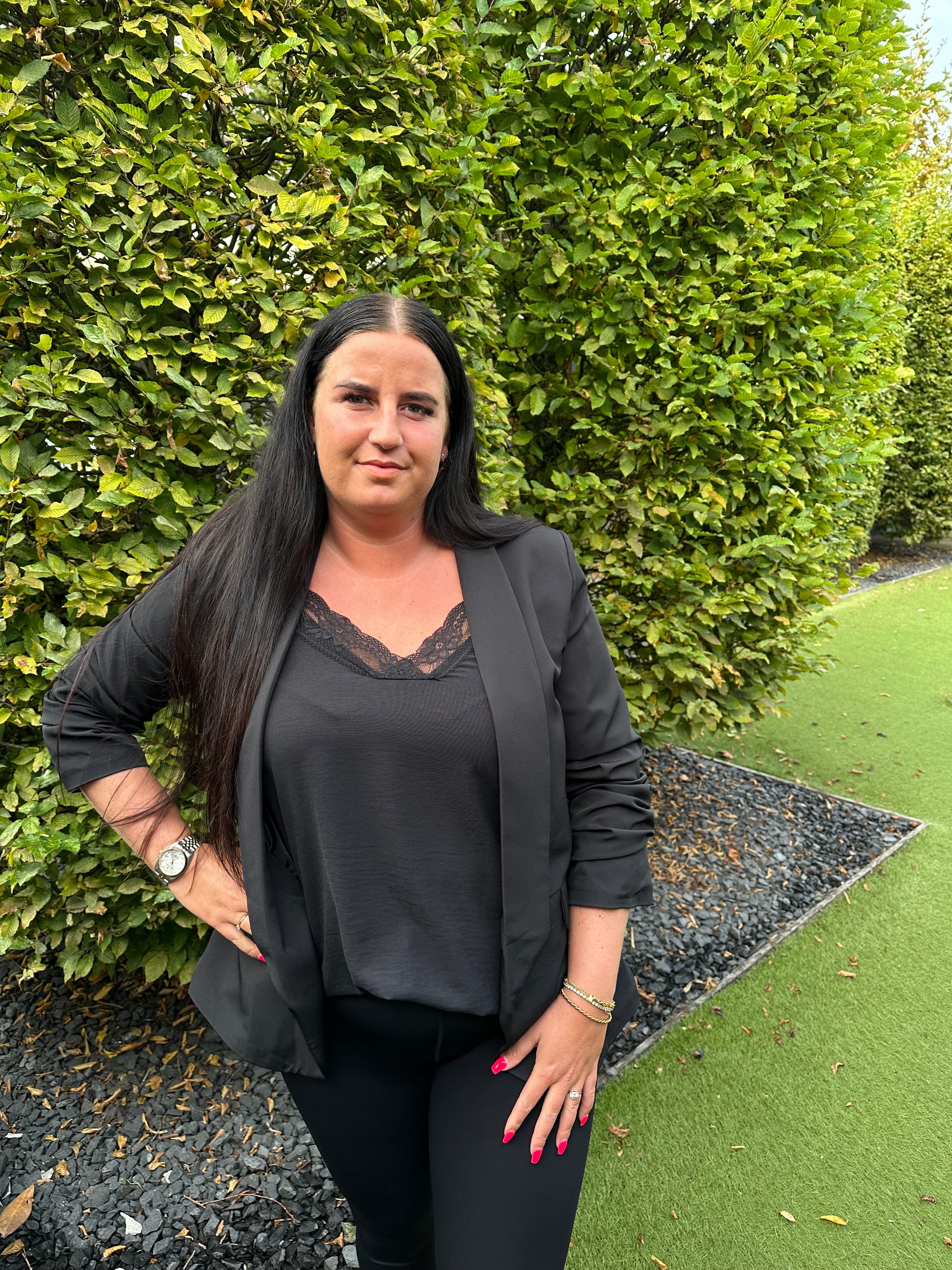 Romy is 1.74 cm en draagt van tops maat 42 en van broek maat 44.