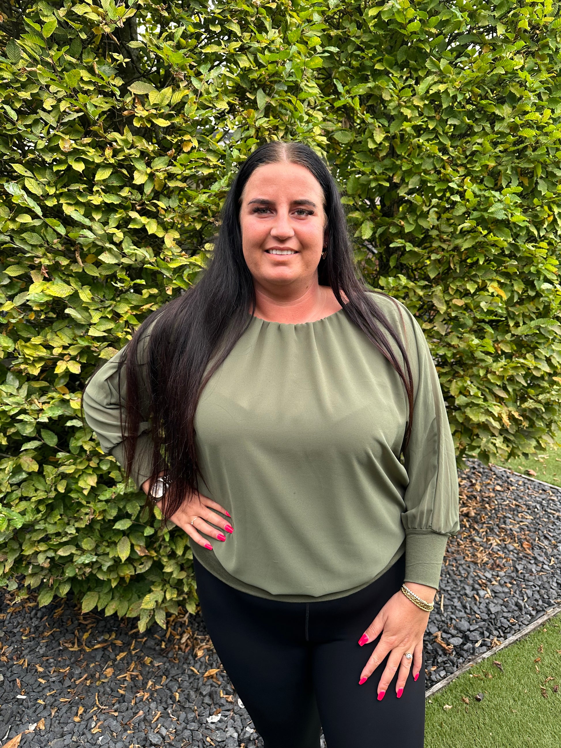 Deze blouse met lange mouw heeft een ronde hals waar elastiek in zit, waardoor deze ook off shoulder te dragen is. Onderaan zit een brede band, waardoor er bij de buik extra ruimte ontstaat en dat maakt de blouse ook zo gewild. Ook aan de mouw zit hetzelfde boordje als aan de onderkant van de blouse