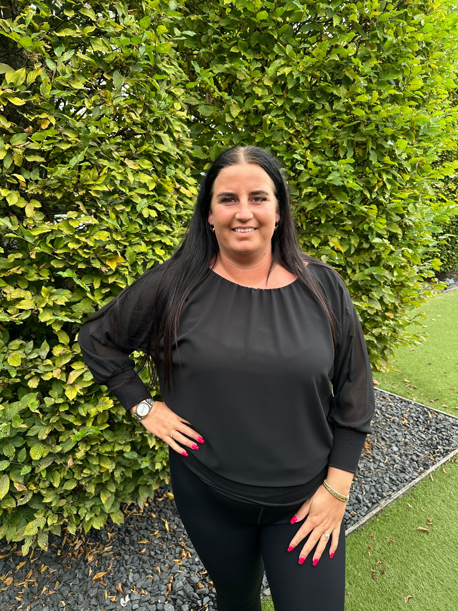 Deze blouse met lange mouw heeft een ronde hals waar elastiek in zit, waardoor deze ook off shoulder te dragen is. Onderaan zit een brede band, waardoor er bij de buik extra ruimte ontstaat en dat maakt de blouse ook zo gewild. Ook aan de mouw zit hetzelfde boordje als aan de onderkant van de blouse