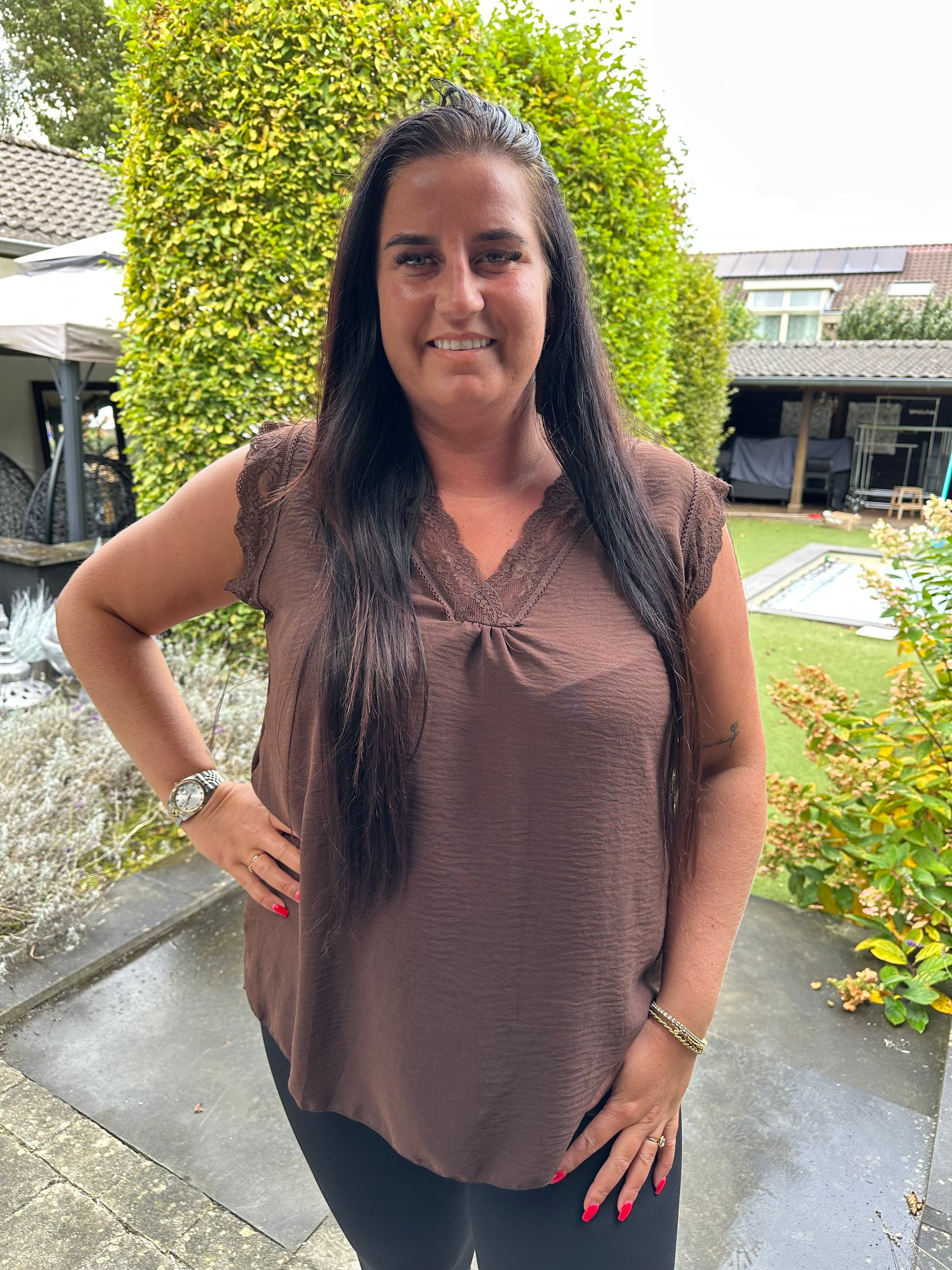 Dit mooie hemdje met een kanten V hals heeft ook een klein kantje op de mouw. Heerlijke basis voor ergens onder.