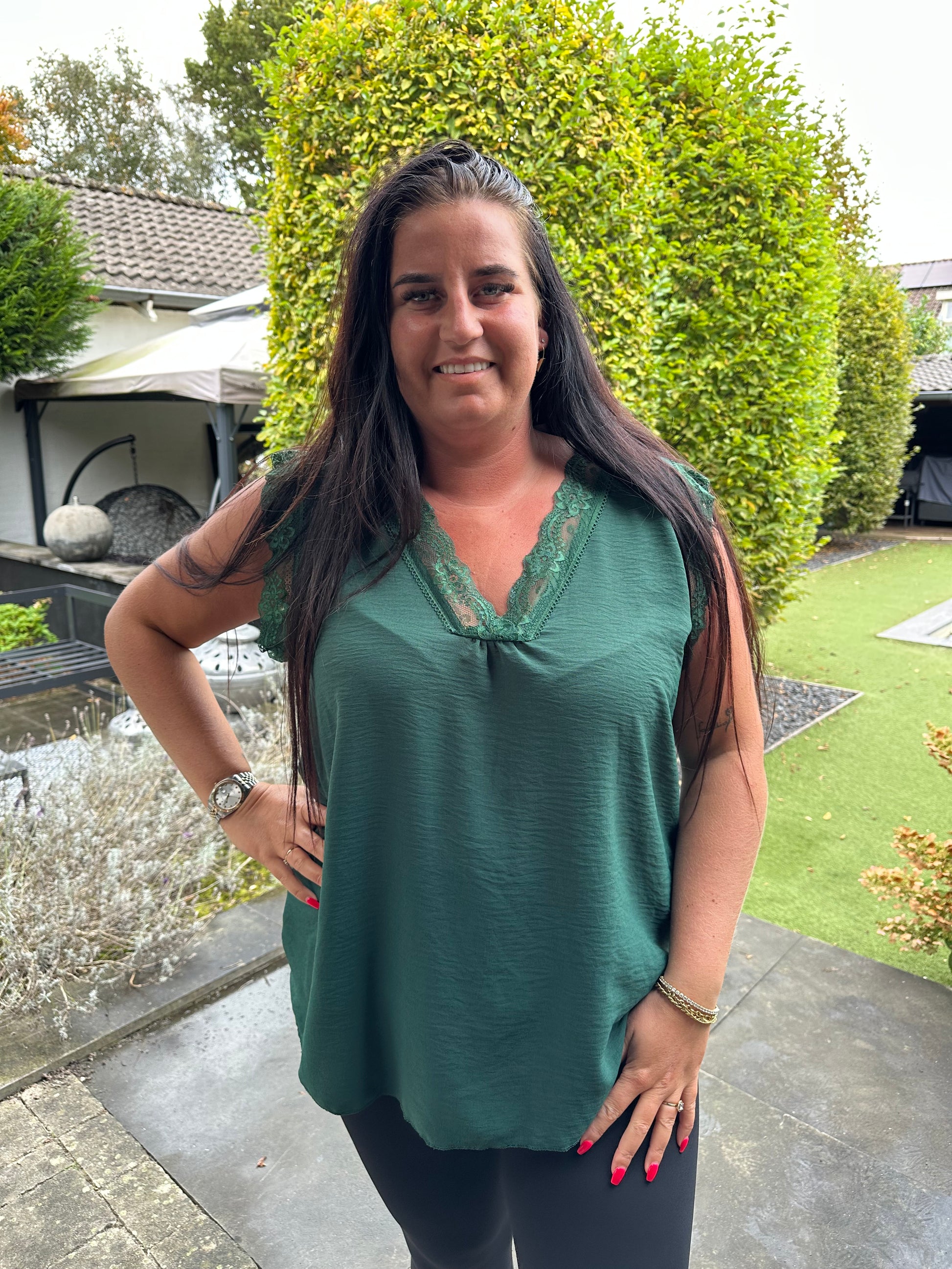 Dit mooie hemdje met een kanten V hals heeft ook een klein kantje op de mouw. Heerlijke basis voor ergens onder.