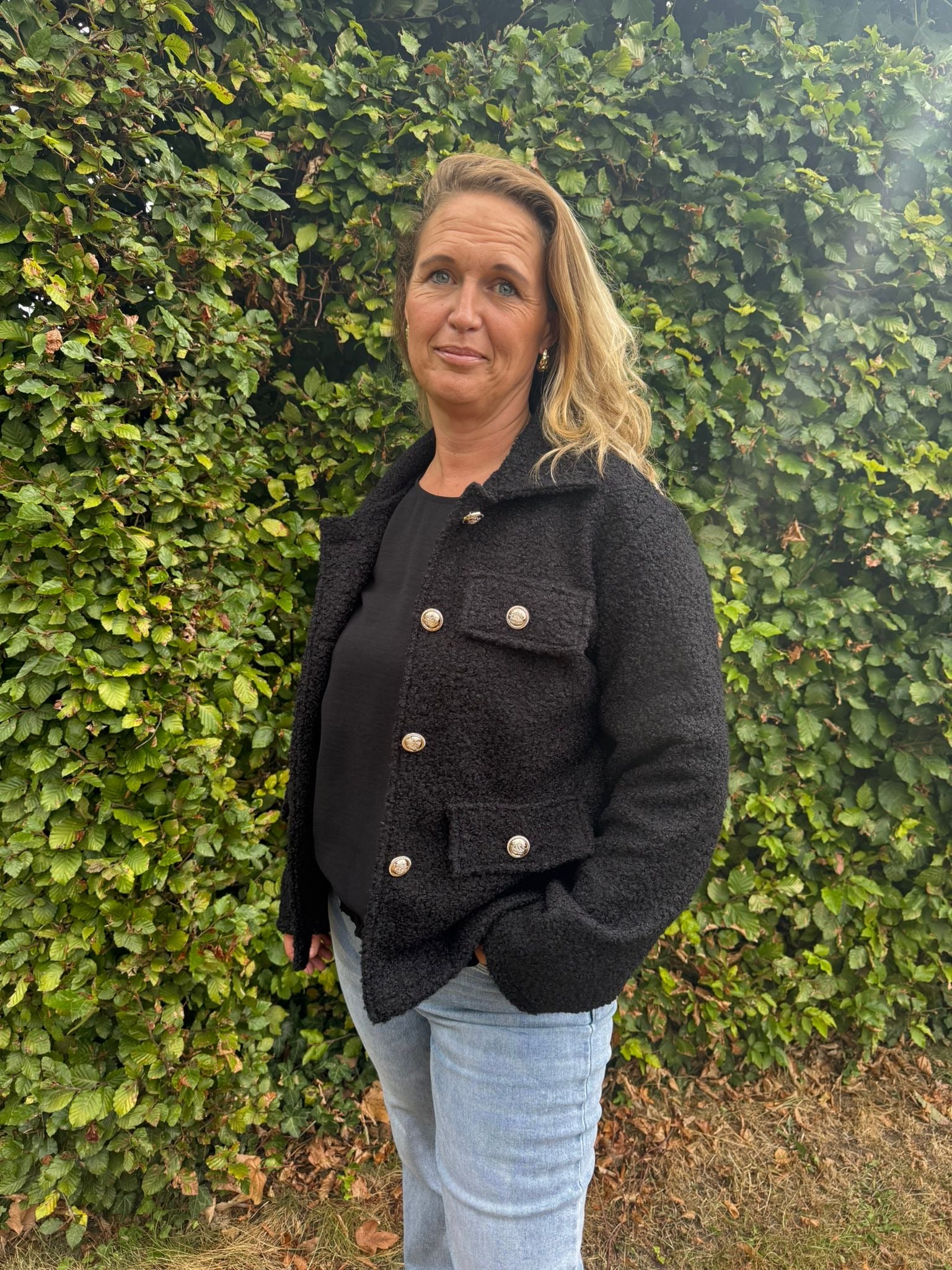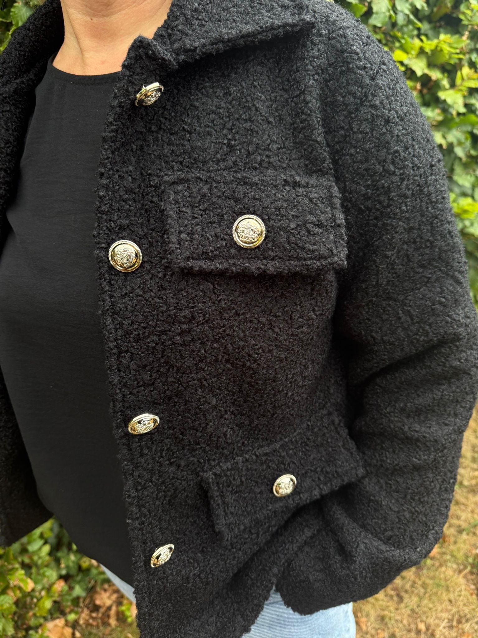 Dit leuke trendy warme teddy jasje heeft 4 gouden knopen waarmee het jasje echt dicht kan en aan de voorkant ook nog 4 nep zakjes.