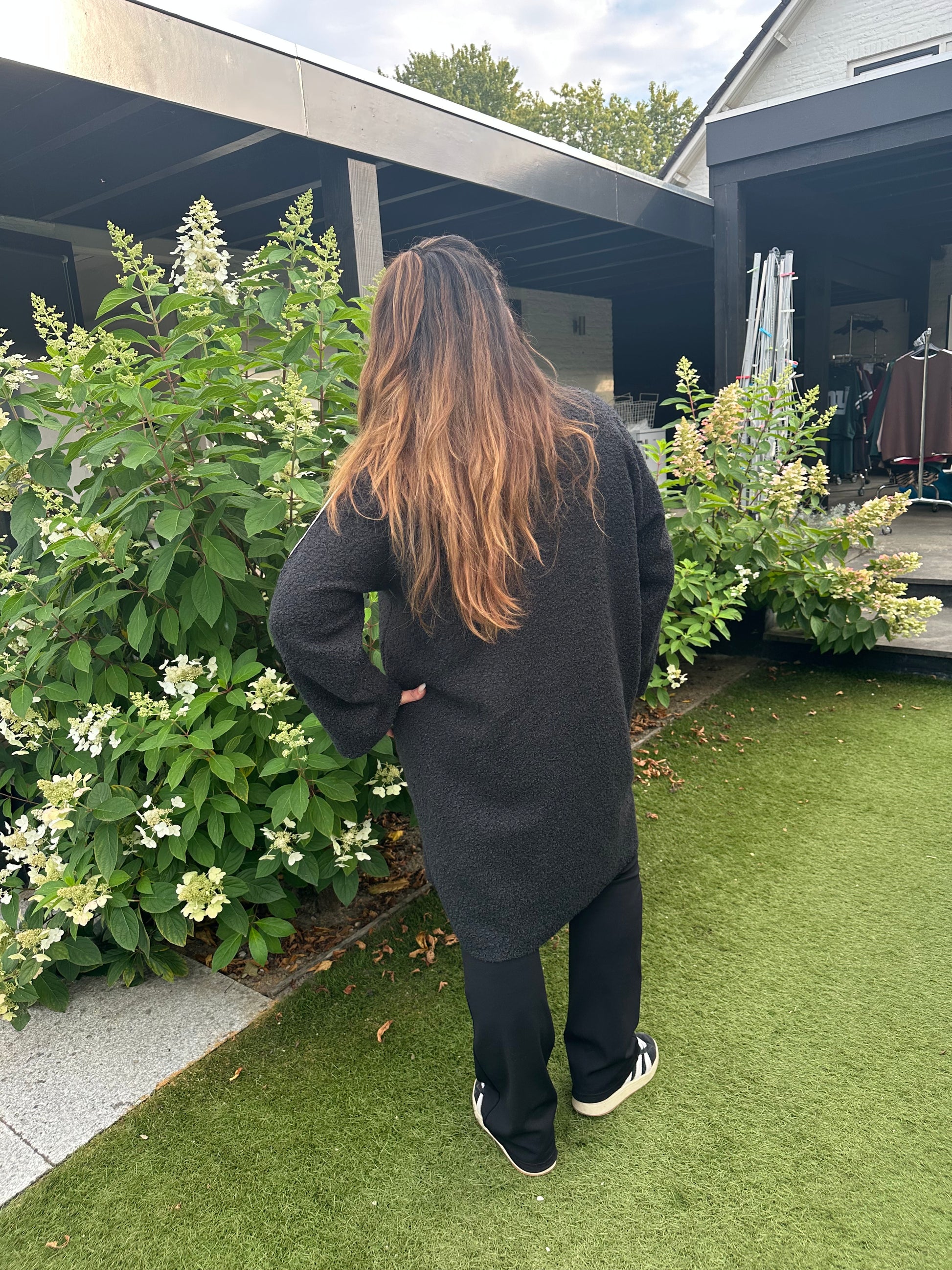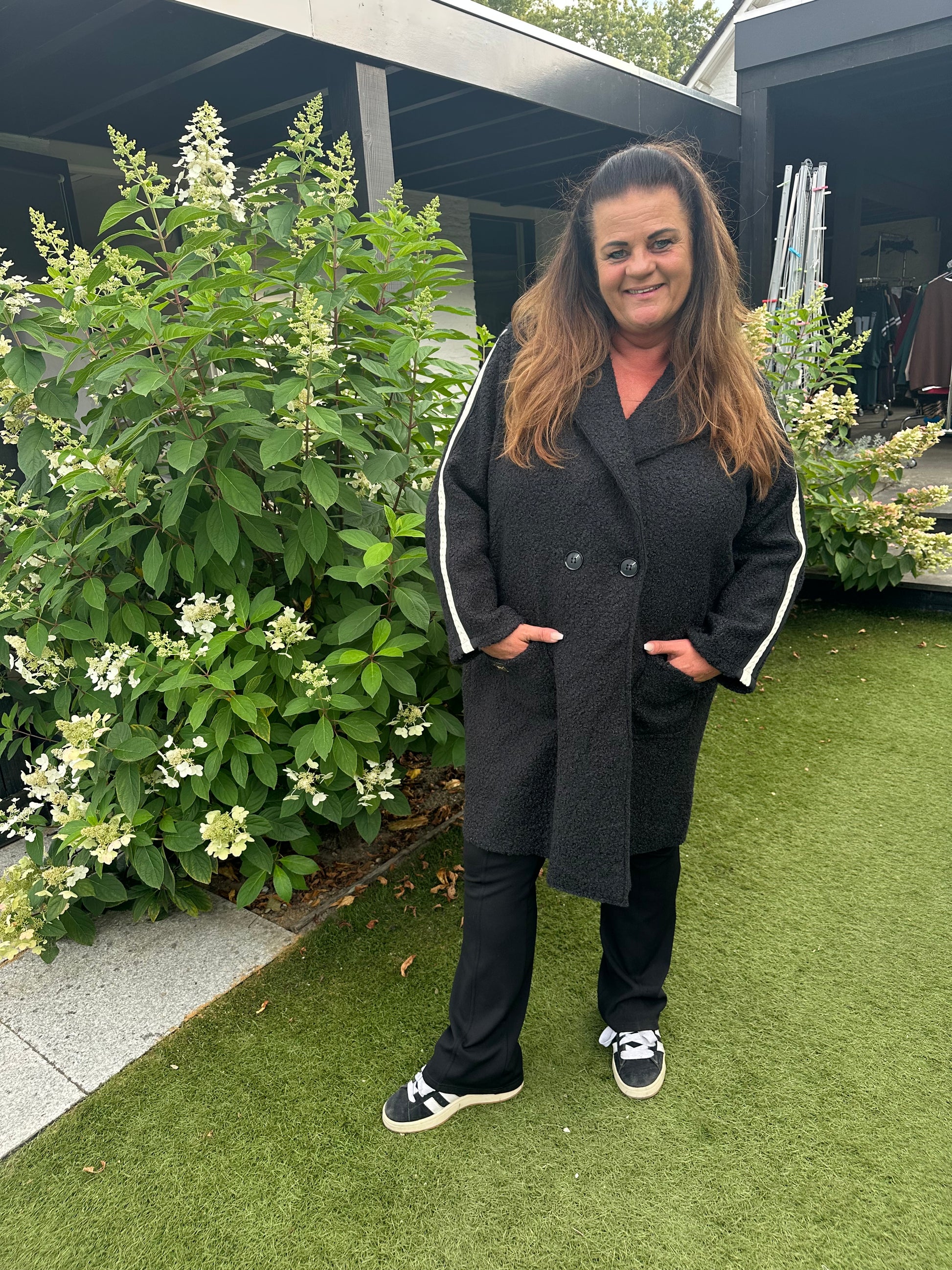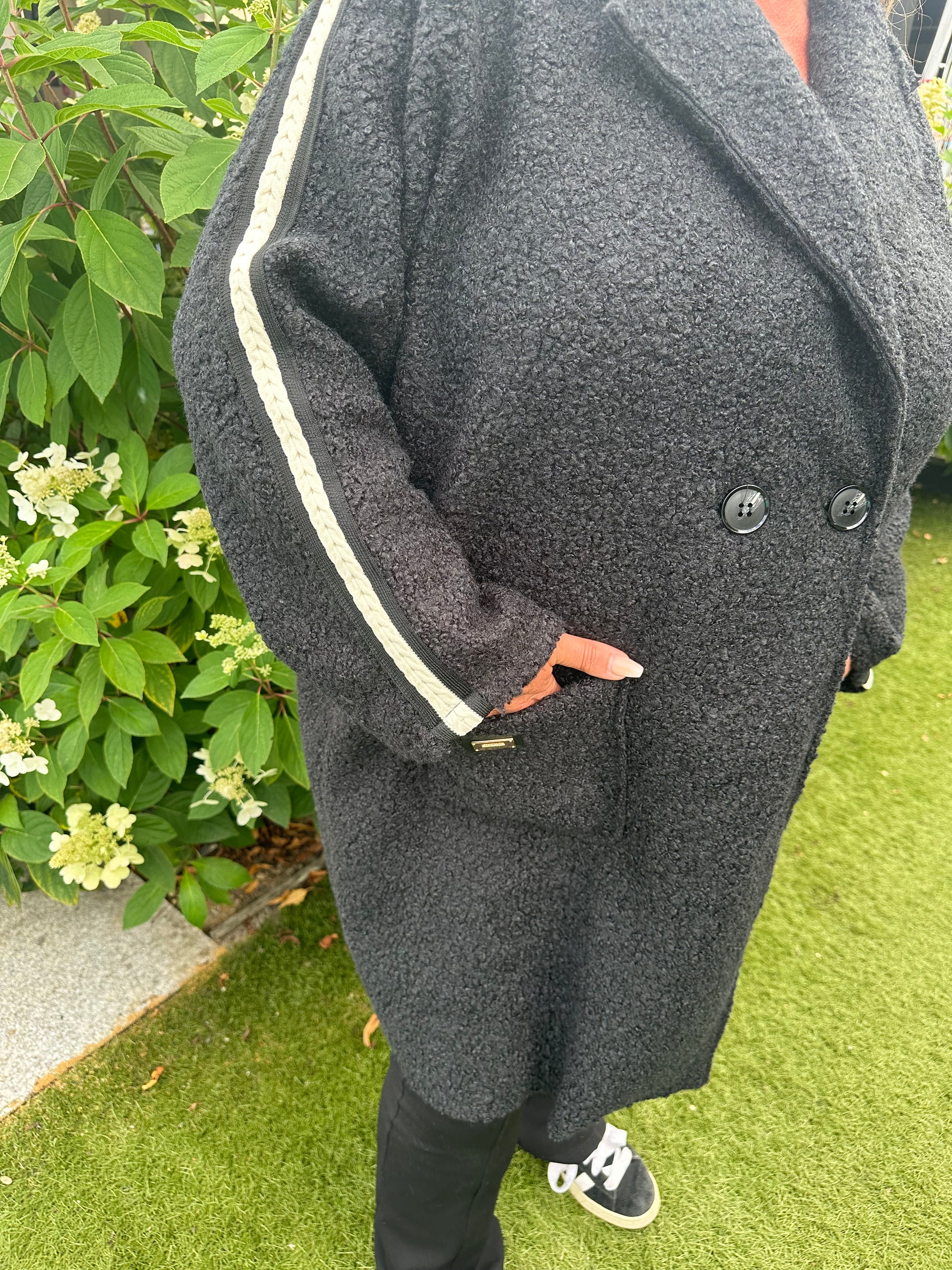 Een leuke lange teddy jas met een hoog knuffelgehalte met op de mouw een leuke witte bies. De jas heeft 2 echte zakken aan de voorkant en is afsluitbaar met 2 knopen.