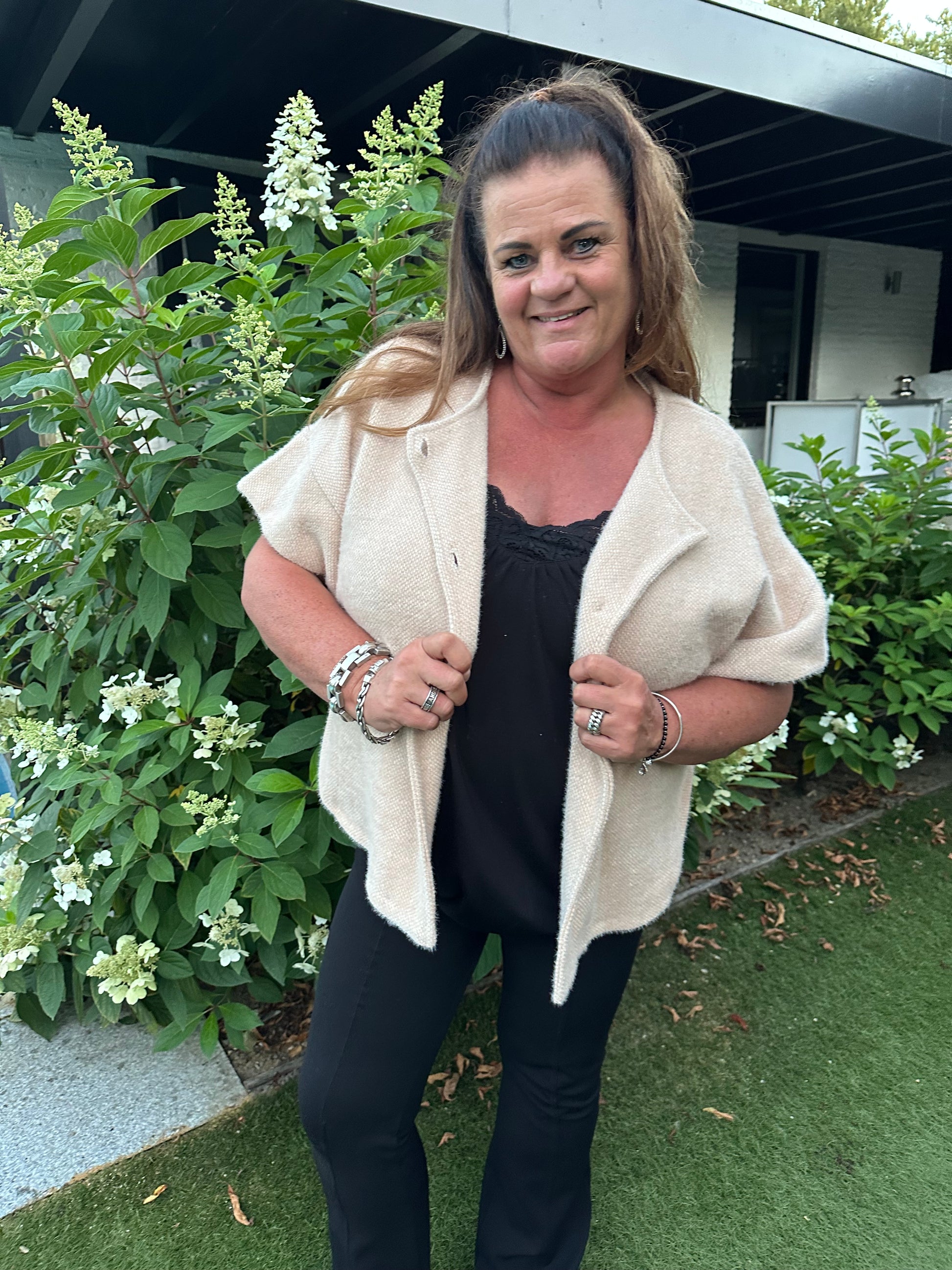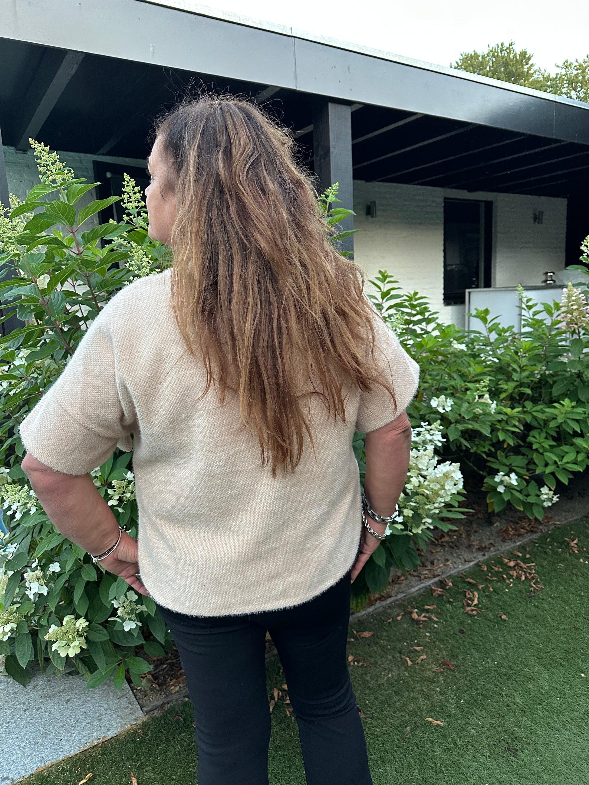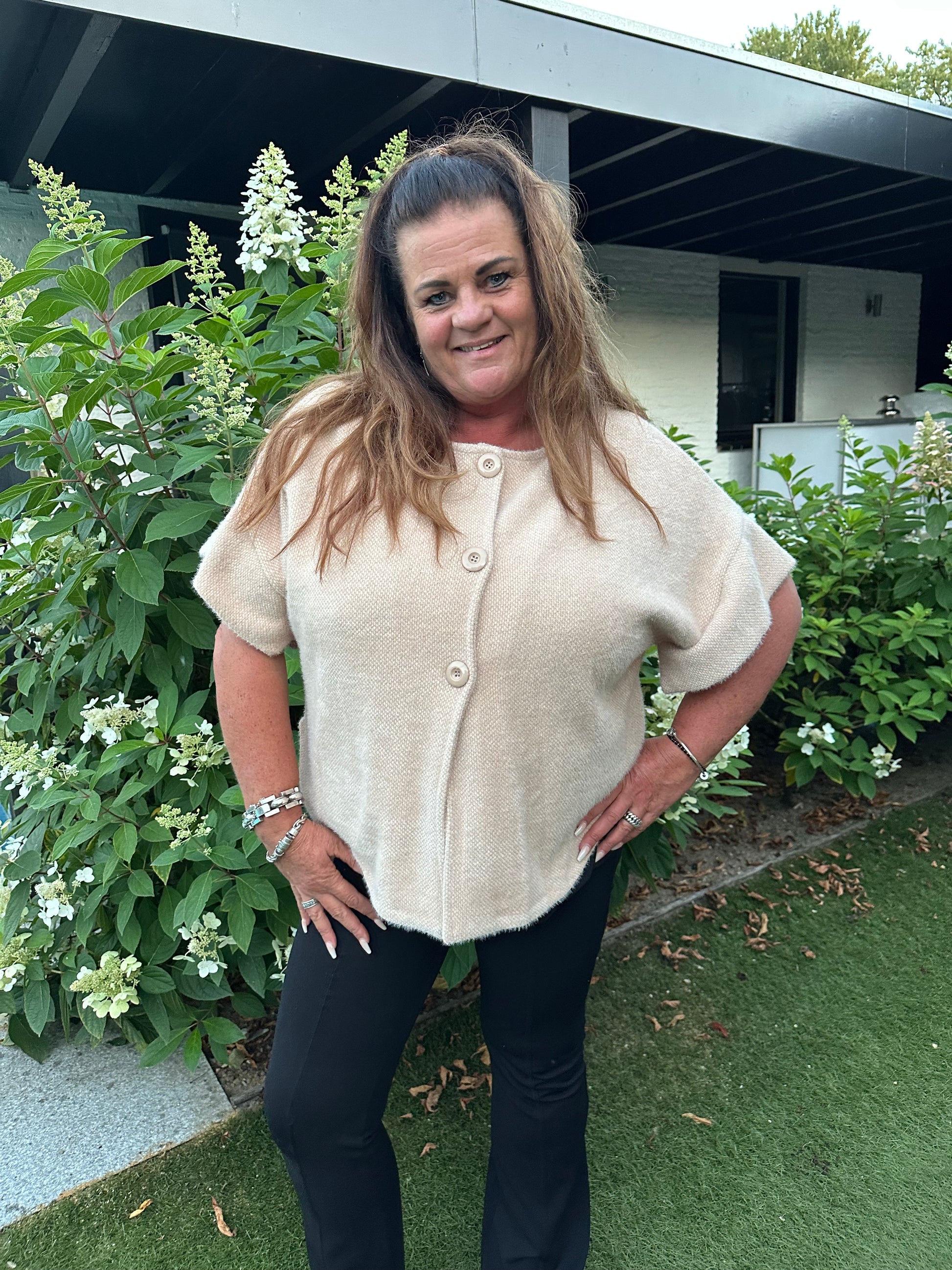 Dit leuke vestje van iets dikkere stof en met een korte mouw heeft 3 knopen en loopt aan de onderzijde aan de zijkanten rond in een soort splitje.