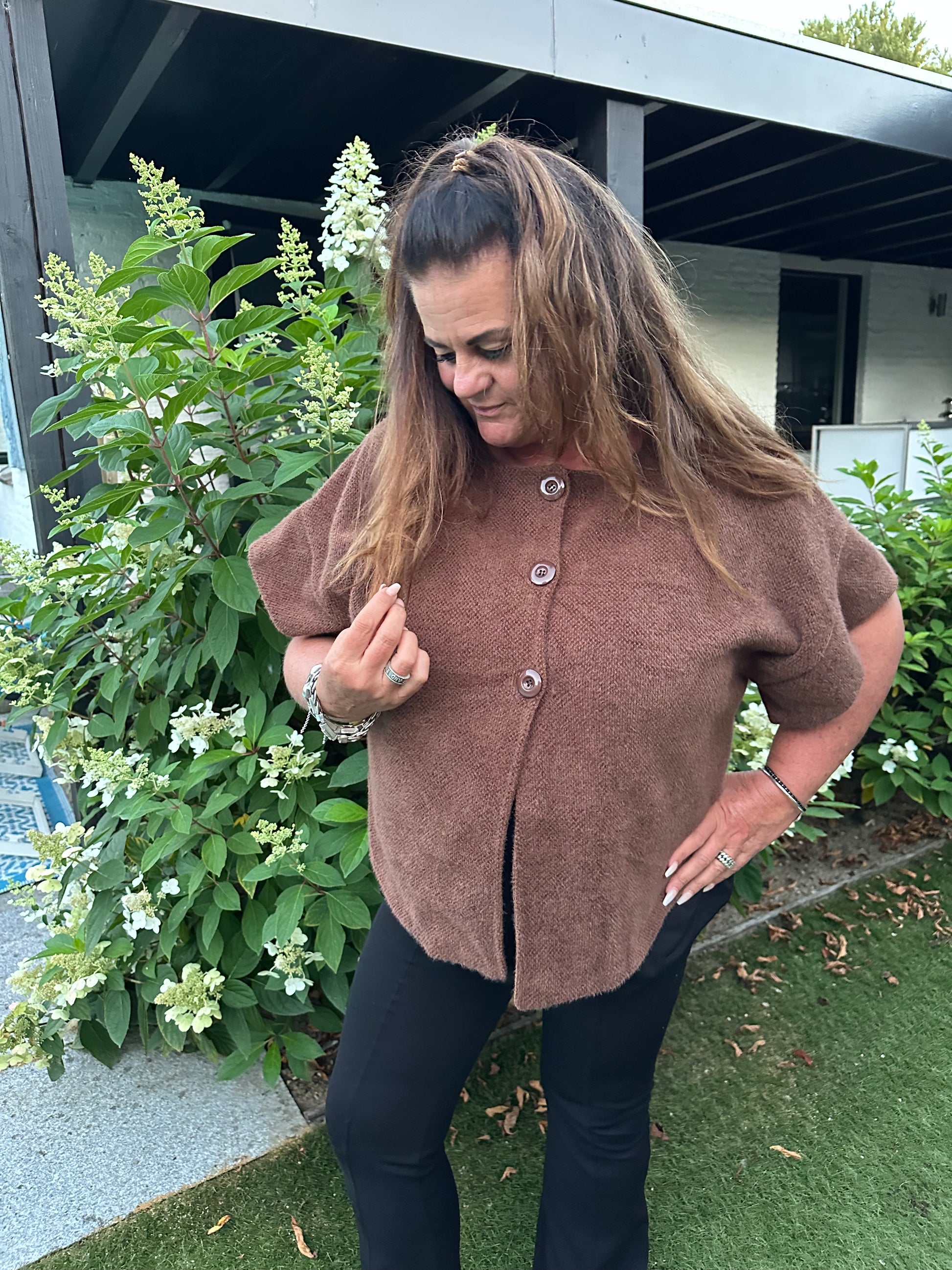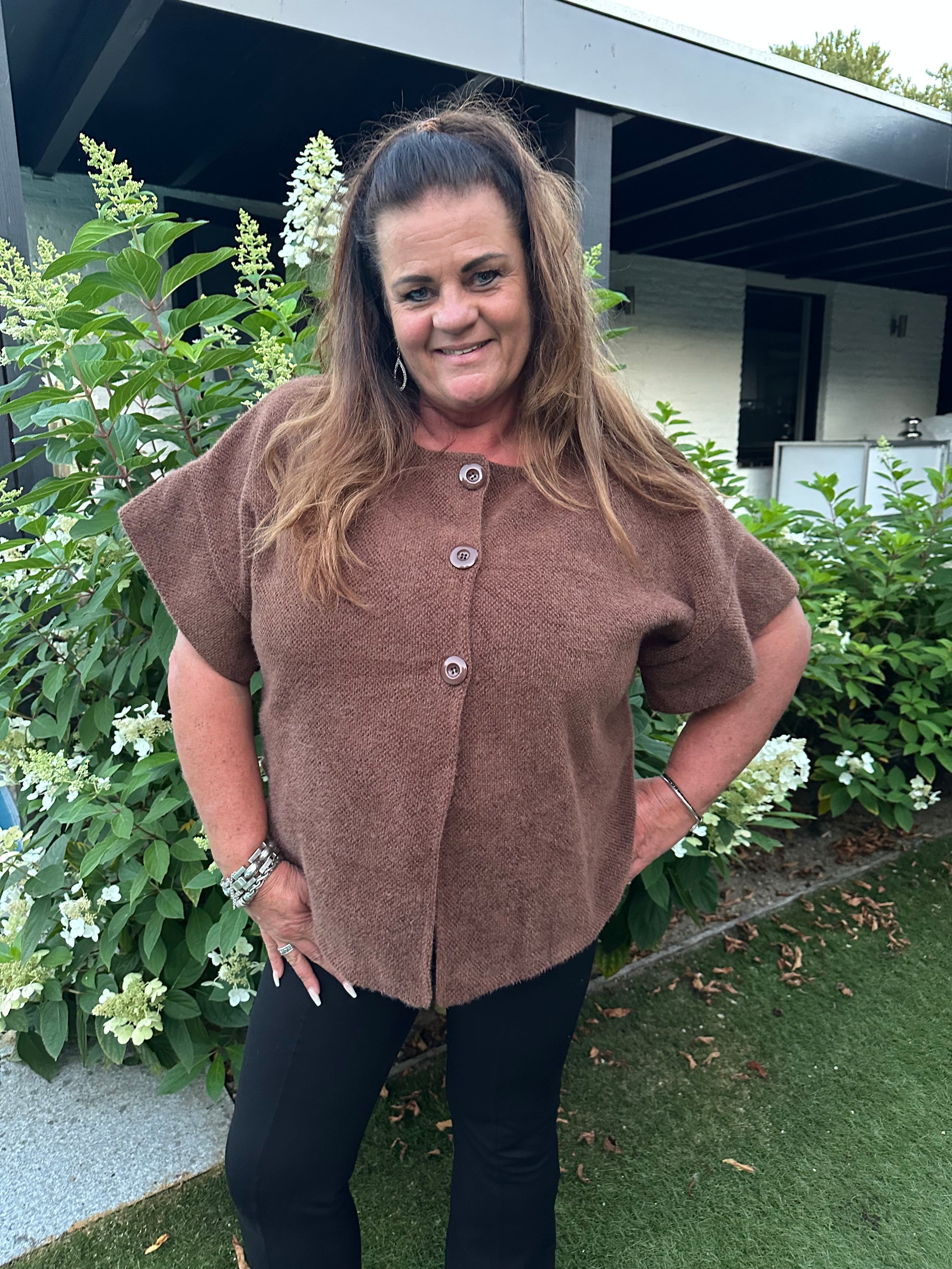 Dit leuke vestje van iets dikkere stof en met een korte mouw heeft 3 knopen en loopt aan de onderzijde aan de zijkanten rond in een soort splitje.