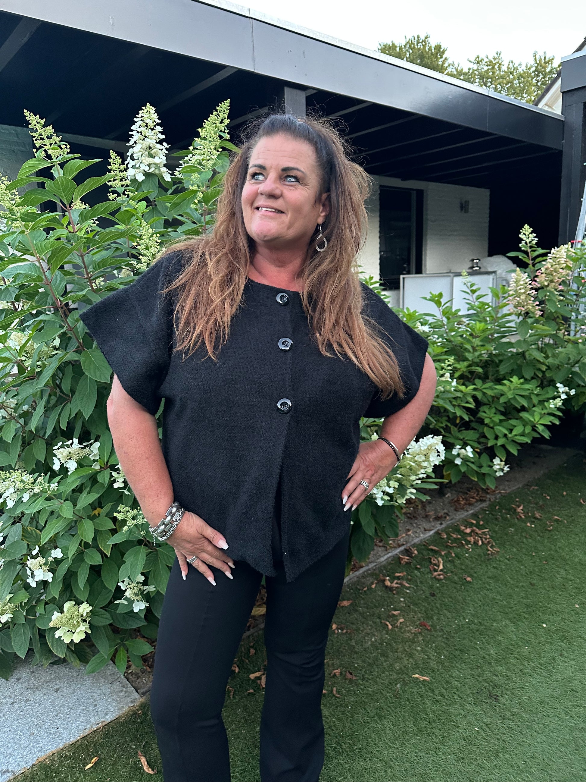 Dit leuke vestje van iets dikkere stof en met een korte mouw heeft 3 knopen en loopt aan de onderzijde aan de zijkanten rond in een soort splitje.