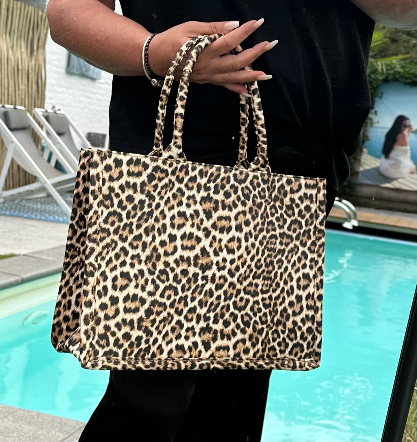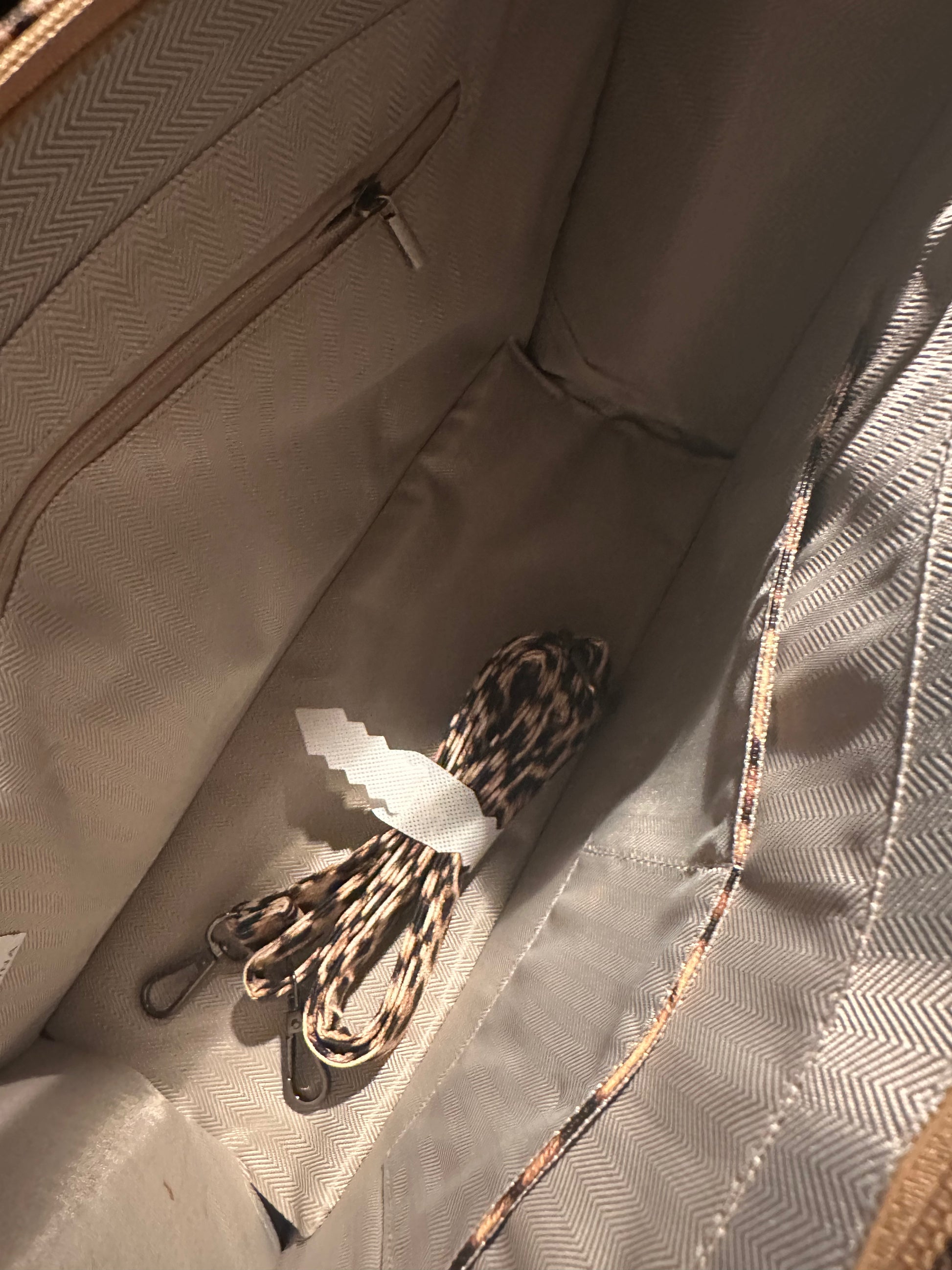 De tas heeft een lang hengsel in de print van de tas en 1 groot vak met aan de binnenkant aan de zijkanten meerdere vakjes.