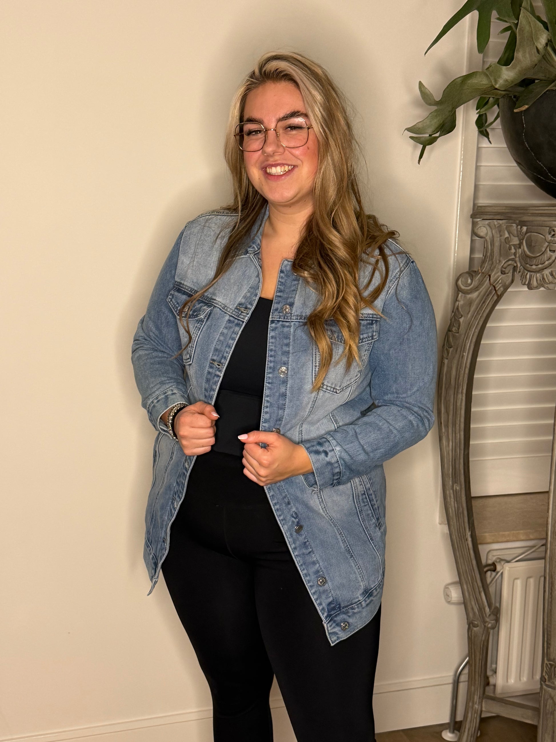 Dit spijkerjasje is een langer model. Het heeft geen stretch, maar valt wel op maat. Bij twijfel zou ik zelf kiezen voor een maatje groter.