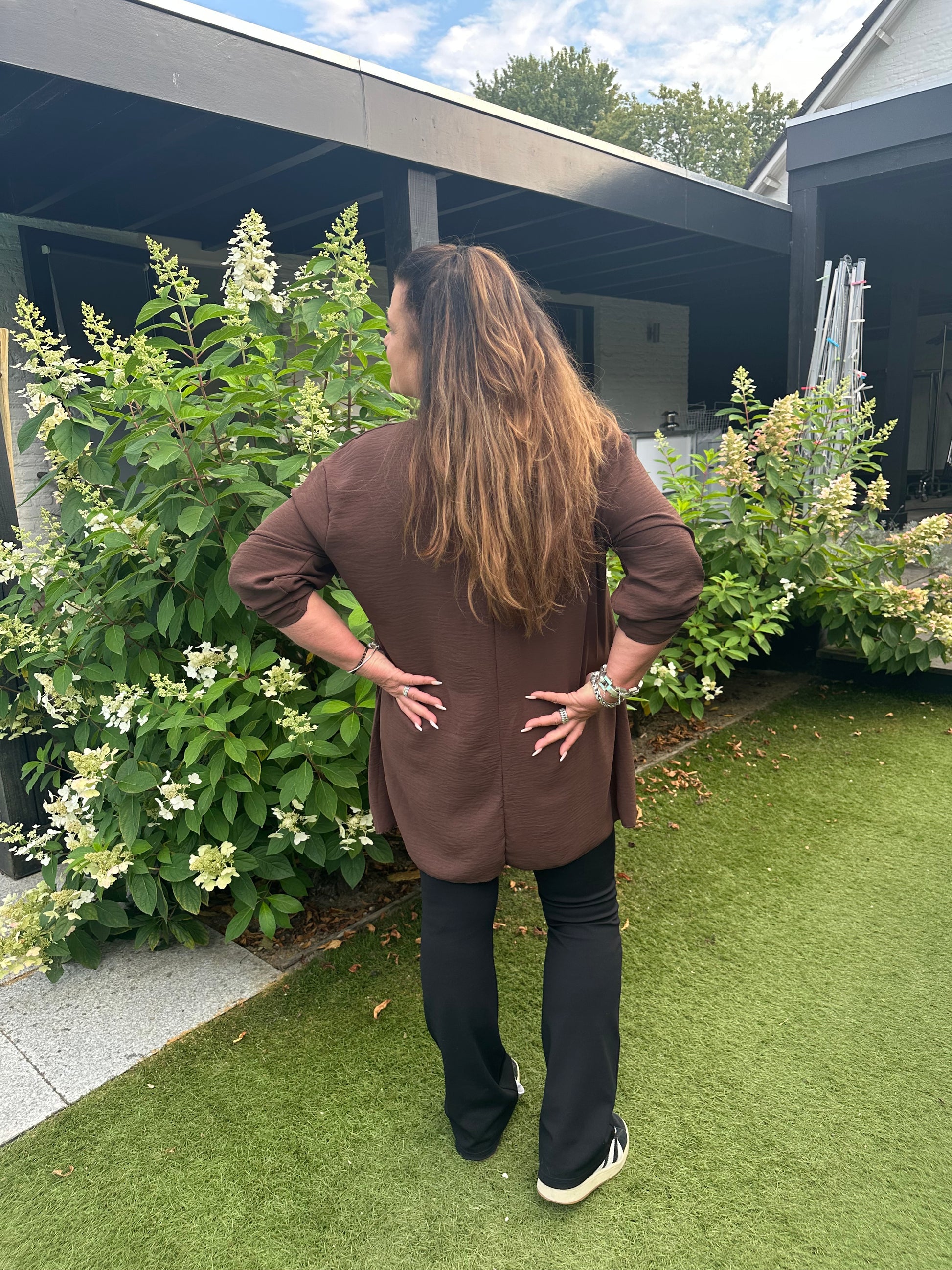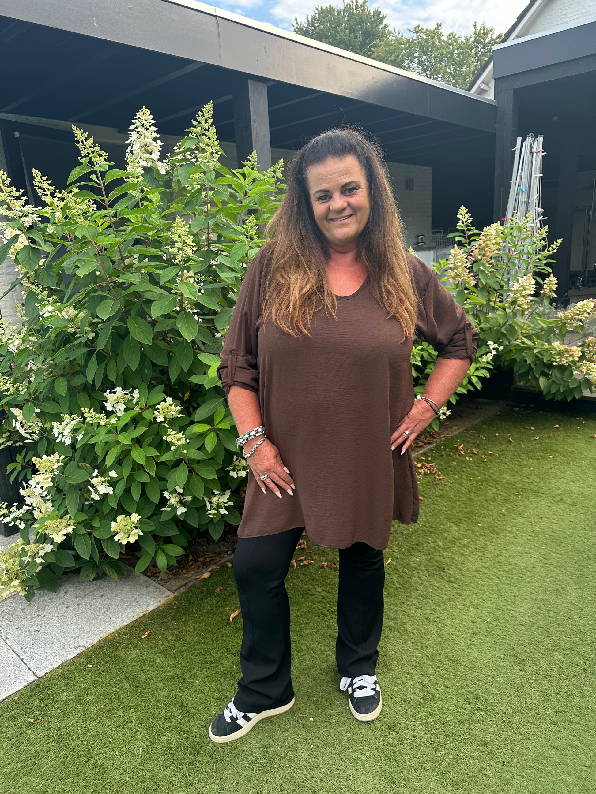 Kaatje is 1.71 cm en draagt van tops maat 46-48 en van broek maat 44.