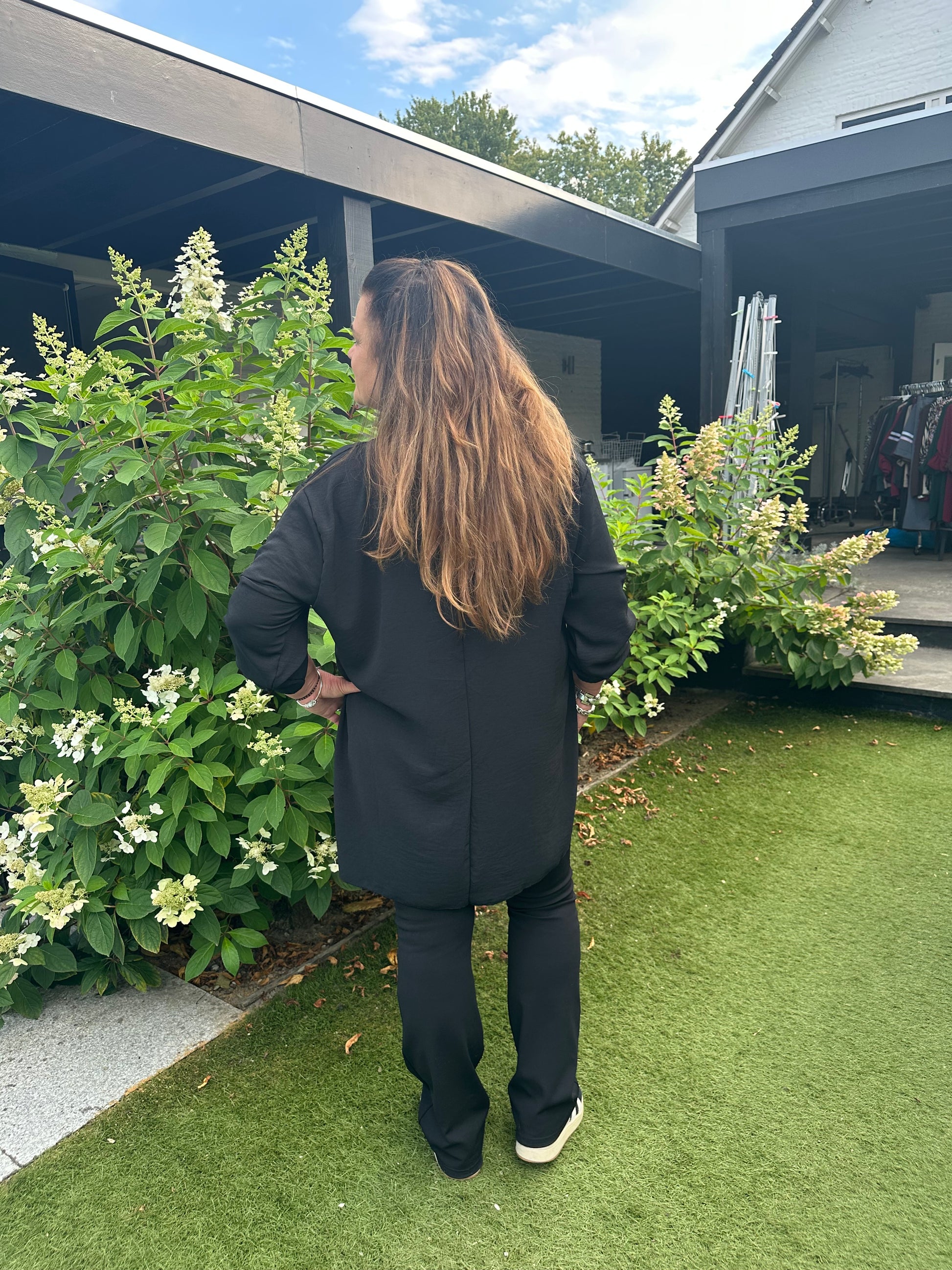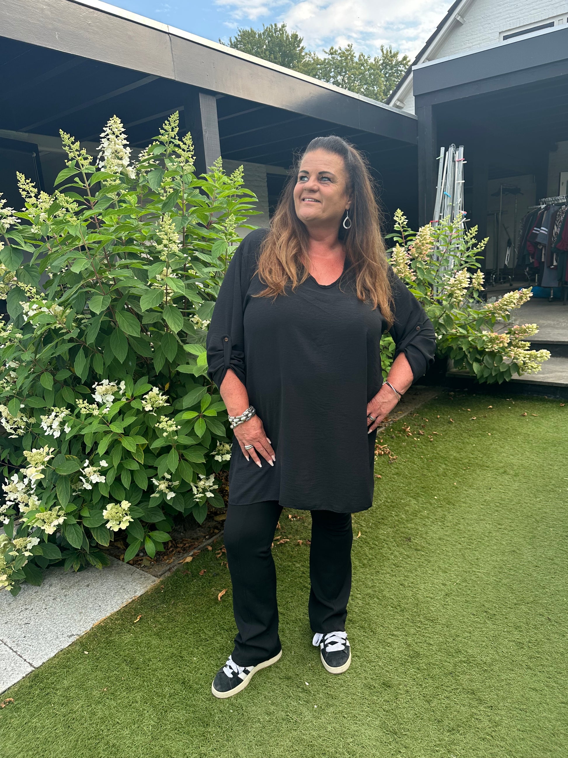 Kaatje is 1.71 cm en draagt van tops maat 46-48 en van broek maat 44.